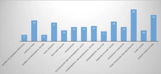 其他文章發(fā)表比較多的二區(qū)雜志及文獻發(fā)表數(shù)量大致如下:Journal of Hazardous Materials,6篇;Horticulturae,19篇;Journal of Experimental Botany,6篇;Algal Research,17篇;BMC Plant Biology,10篇;Chemosphere,13篇;Ecotoxicology and Environmental Safety,13篇;Environmental and Experimental Botany,14篇;Environmental Pollution,9篇;Frontiers in Plant Science,18篇;Physiologia Plantarum,13篇;Plant Physiology and Biochemistry,29篇;Plant Science,10篇;Scientia Horticulturae,24篇;共計201篇。