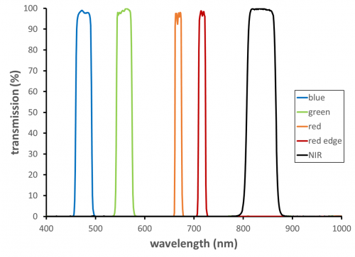 農作物監測濾光片——紅色波段(red)在葉綠素A/B重疊區域的中心,而紅色邊緣波段(red edge)在反射率曲線的上升邊緣的中心。