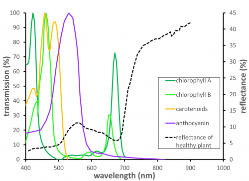 植物中常見的色素包括主要的葉綠素A和B,它們賦予植物綠色,但也包括不同數量的類胡蘿卜素和花青素。反射光譜在波長被吸收的位置下降。