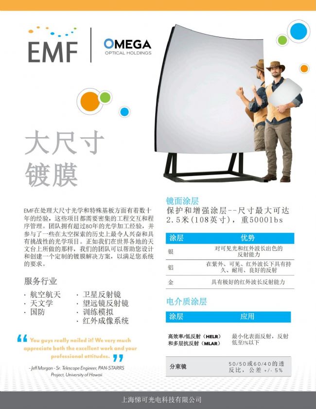 EMF在處理大尺寸光學(xué)和特殊基板方面有著數(shù)十年的經(jīng)驗,這些項目都需要密集的工程交互和程序管理。團隊擁有超過八十年的光學(xué)加工經(jīng)驗,并參與了一些在太空探索的歷史上最令人興奮和具有挑戰(zhàn)性的光學(xué)項目。正如我們在世界各地的天文臺上所做的一樣。我們的團隊可以幫助您設(shè)計和創(chuàng)建一個定制的鍍膜解決方案,以滿足您系統(tǒng)的要求。