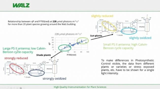 Schansker博士詳細介紹了P700測量的基本原理,近紅外檢測波長的選擇,Pm和其他P700 氧化還原相關的參數,如Y(I),Y(ND),Y(NA)的計算方法和生理學意義。之后對Dual-PAM-100軟件中的各項設置和功能進行了講解,特別是腳本界面及飽和脈沖設置等界面進行了詳細介紹。Schansker博士還結合具體的應用案例講解了P700相關測量的具體使用和科研思路,對數據測量和分析過程中容易出現的問題也進行了探討和總結,例如PSI熒光在Fo中占有一定比例,如C3植物大約在25%,可在軟件中進行設定并對數據進行修正,可使得ETR(II)的計算更為準確,這對研究ETR(II)和ETR(I)的關系具有重要價值。