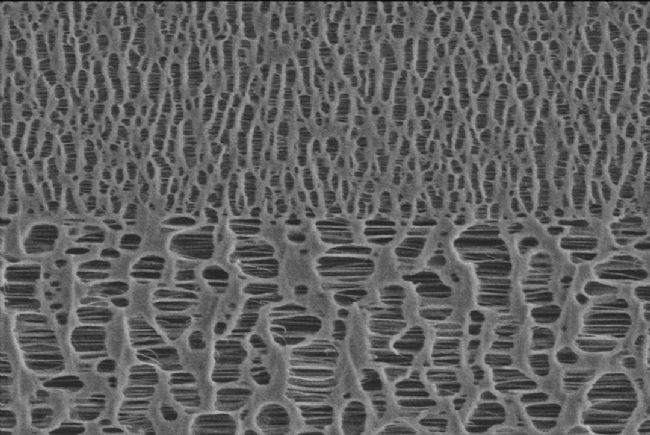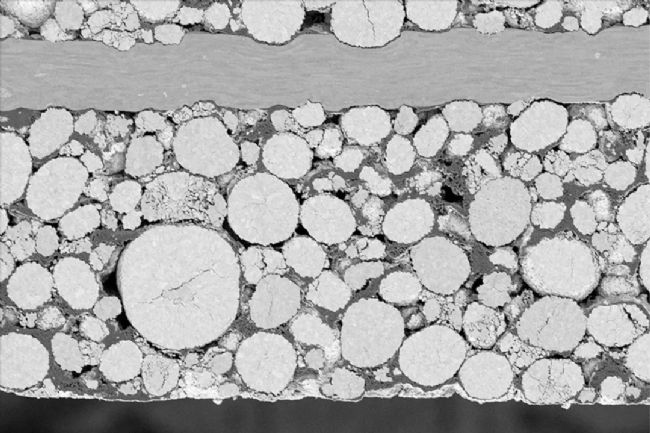 圖2電池隔膜橫截面掃描電子顯微鏡圖像。具有兩種不同微觀結構的聚烯烴相,可以清晰地觀察到明顯差異(來源:Technoorg Linda)