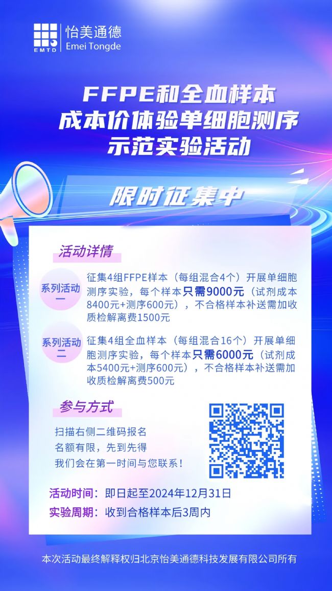 針對血液樣本和FFPE樣本做單細胞測序存在的各種問題,北京怡美通德科技發展有限公司現特推出“單細胞測序Flex新技術展示”系列征集活動,對客戶提供的真實樣本(FFPE或全血),用10x Flex固定的方法進行單細胞測序示范實驗,您只需用試劑和測序的成本價格,即可體驗單細胞測序,獲得高質量的數據結果,還可以來EMTD Demo Lab觀摩實驗過程。名額有限,先到先得!