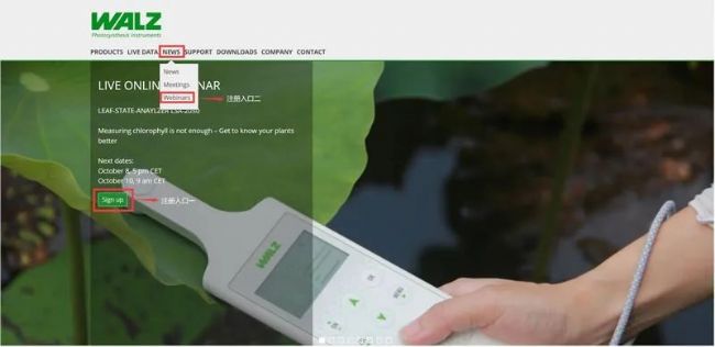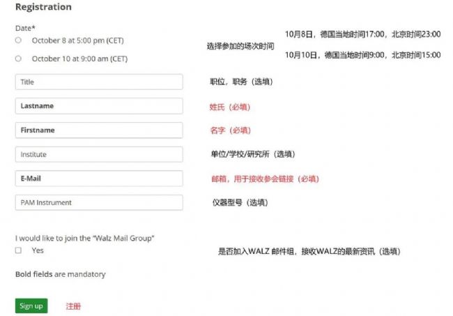 打開德國WALZ公司官網(www.walz.com)即可看到注冊入口,點擊Sign up,可直達注冊頁面,選擇參與的場次時間,填寫信息,點擊Sign up注冊,之后不久就會收到回執(zhí)郵件。郵件包含參會鏈接,開會當天,點擊Online seminar login即可參會。