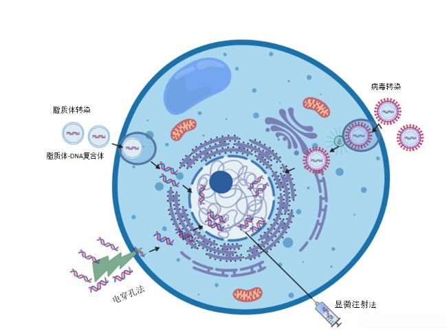 生物介導(dǎo)法:一般利用病毒作為載體,將外源基因包裝后導(dǎo)入細(xì)胞,如慢病毒、腺病毒、逆轉(zhuǎn)錄病毒。這種方法可以實現(xiàn)外源基因的長期穩(wěn)定表達(dá),也可進(jìn)行體內(nèi)、體外高效、特異性的基因轉(zhuǎn)移。但實驗操作較為繁瑣,實驗周期較其他方法長。