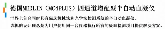 由于市場的需要我方從 2004 年開始研發具有獨立知識產權的MERLIN 系列半自動系列血凝儀包括單通道(MC1),四通道(MC4)和十通道(MC10)三種機型,所有儀器均采用了由“Amelung'公司首創的磁珠機械法檢測原理,通過對于儀器軟硬件的一系列開發使得這種經典的檢測原理能夠全面滿足當前實驗室對于凝血檢測的要求。另外選配的光學檢測通道由我方委托瑞士專業公司開發和制造,可以選裝在所有型號的儀器上(MC1PLUS , MC4PLUS 和 MC10PLUS)。該光學檢測通道采用先進的鋰光源(UV-LED)并具有兩個波長(405nm和650nm可選)。通過軟件可以選擇凝固法、發色底物法等檢測模式,能夠執行磁珠機械法不能開展的檢測項目如:D-Dimer, Protein C, AT III等,從而為用戶使用一臺儀器執行所有凝血項目的檢測提供了解決方案,儀器自帶簡體中文界面, 用戶可以自行安裝和調試。有關儀器介紹的詳細內容請瀏覽我們的網站: