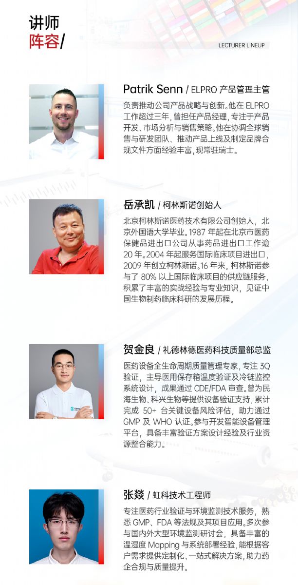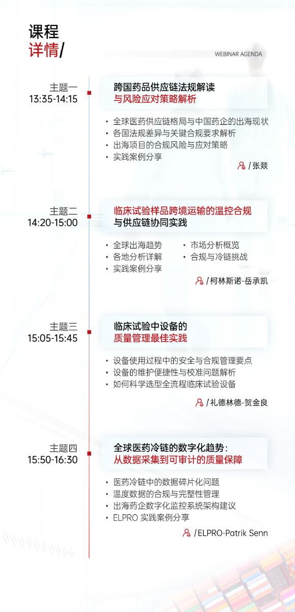 在全球藥品監管日益嚴苛、供應鏈復雜度不斷攀升的當下,虹科&點成攜手ELPRO、柯林斯諾與禮德林德,特別策劃“藥品出海新紀元:溫控合規與供應鏈高效化的全球實踐”專題直播。聚焦藥企國際化進程中的“合規剛需”與“降本增效”兩大核心挑戰,從法規解讀、跨境運輸、設備管理到數字化監控四大關鍵維度,深度解析技術標準、實戰案例與系統化解決方案,助力藥企構建覆蓋全生命周期的合規鏈路,推動中國藥品實現從“出海可行”到“商業成功”!