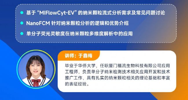 作為生物納米顆粒表征的行業領導者,NanoFCM致力于推動納米檢測技術的標準化與智能化。本期webinar將基于國際公認的單EV流式細胞術分析圣經–MIFlowCyt-EV(Minimum Information about a FC Experiment standard in an EV-FC-specific reporting framework, MIFlowCyt-EV),探討納米顆粒的流式分析需求,聚焦先進單分子流式技術在單個納米顆粒表征的應用及檢測結果評估,惠及外泌體、脂質納米顆粒及病毒等研究領域的基礎科研和產業化。