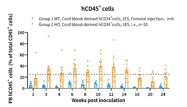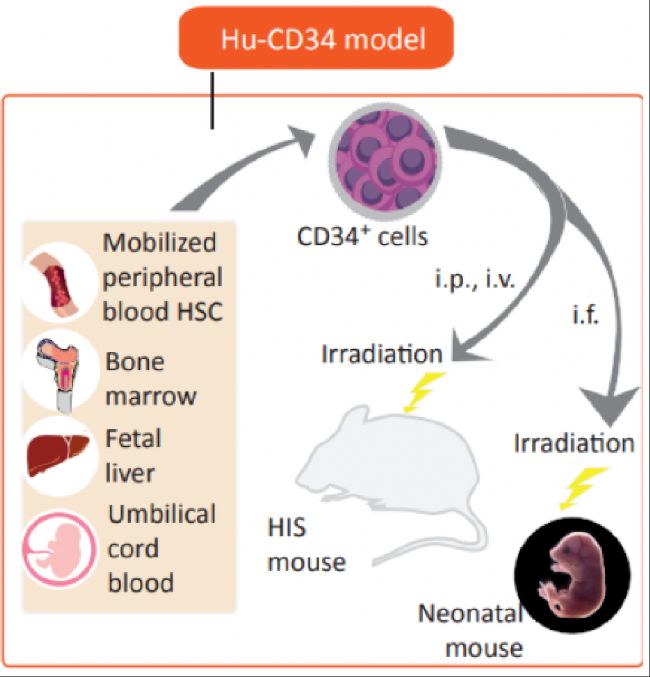 HSC(CD34+)模型是目前臨床前應(yīng)用的一類重要的免疫系統(tǒng)人源化小鼠模型,通過將人CD34+造血干細(xì)胞(HSC)由腹腔或者尾靜脈注入免疫缺陷小鼠,可以實(shí)現(xiàn)了人類免疫系統(tǒng)的重建。