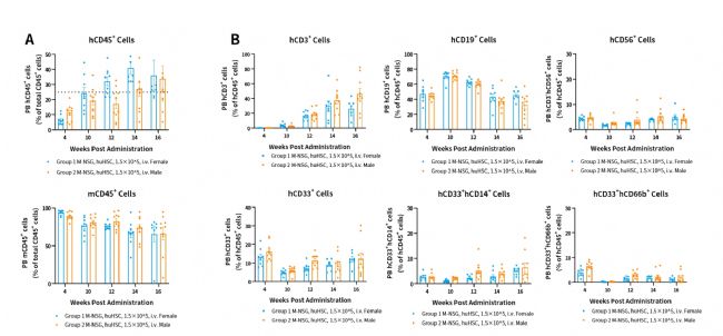 Fig6. Humanized immune reconstitution levels in huHSC-hIL3-hCSF2-Tg(M-NSG) mice.
