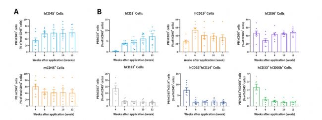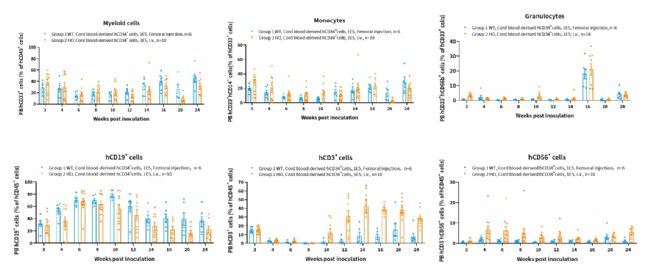 將新生的hIL3-hCSF2-Tg(M-NSG)小鼠進(jìn)行亞致死計量輻照清髓,尾靜脈注射臍血來源的CD34陽性的HSC細(xì)胞,并在注射后3-24周取血進(jìn)行流式分析: