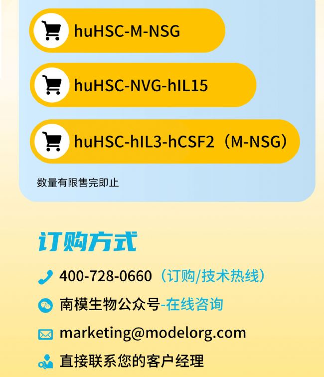 然而由于物種差異,在免疫重建過程中M-NSG小鼠的鼠源細(xì)胞因子無法有效支持人源NK、髓系等免疫細(xì)胞的發(fā)育,限制了其免疫重建的效果。為了突破重度免疫缺陷小鼠的免疫系統(tǒng)重建難關(guān),南模生物針對免疫調(diào)節(jié)因子基因進(jìn)行人源化改造,在更多基因修飾的小鼠背景上開發(fā)出一系列升級版HSC (CD34+) 模型,能夠更好的模擬藥物進(jìn)入人體后免疫系統(tǒng)的響應(yīng),對腫瘤免疫領(lǐng)域有重要的推進(jìn)作用。