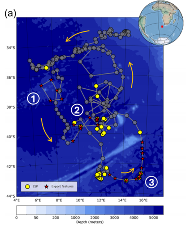 本研究借助BGC-Argo浮標搭載的UVP6-LP系統,揭示了南大西洋渦旋邊緣存在高效碳輸送機制:在渦旋界面強鋒區,垂直流場與重力沉降協同作用,顯著提升有機碳向深海的輸運效率。該工作為理解生物泵在復雜海洋環流系統中的作用提供了新視角。