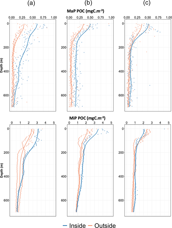圖3 輸出特征區內外MiP POC(微米級顆粒)與MaP POC(宏觀顆粒)的垂向分布對比
