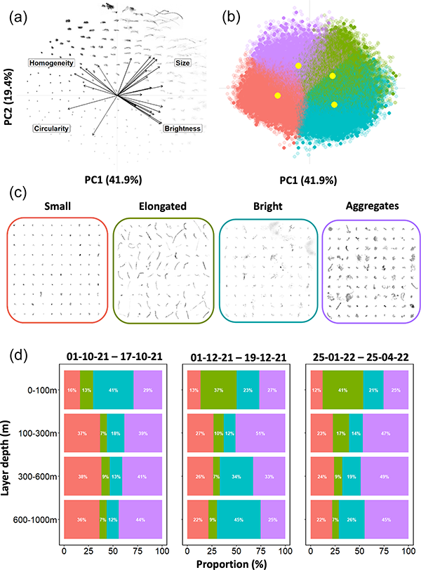 形態垂向分層:表層以細長顆粒為主(可能為硅藻鏈),而中層以致密聚集體為主(300-600m層占比47%)(圖4d),表明高密度顆粒更易沉入深層。