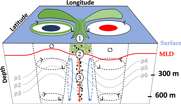 (3)物理增強輸送:渦旋交界處的強下沉流(亞中尺度過程)將顆粒加速輸送到600m以深,速度超過純重力沉降。