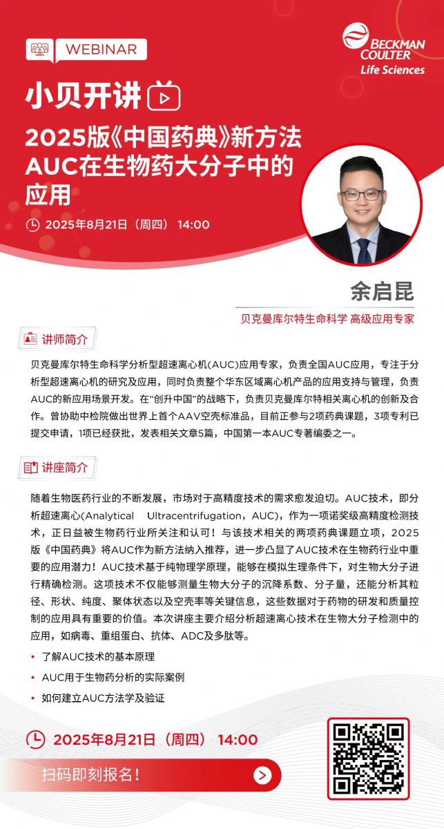 隨著生物醫(yī)藥行業(yè)的不斷發(fā)展,市場對于高精度技術(shù)的需求愈發(fā)迫切。AUC技術(shù),即分析超速離心 (Analytical Ultracentrifugation,AUC) ,作為一項(xiàng)諾獎(jiǎng)級高精度檢測技術(shù),正日益被生物藥行業(yè)所關(guān)注和認(rèn)可!與該技術(shù)相關(guān)的兩項(xiàng)藥典課題立項(xiàng),2025版《中國藥典》將AUC作為新方法納入推薦,進(jìn)一步凸顯了AUC技術(shù)在生物藥行業(yè)中重要的應(yīng)用潛力!AUC技術(shù)基于純物理學(xué)原理,能夠在模擬生理?xiàng)l件下,對生物大分子進(jìn)行精確檢測。這項(xiàng)技術(shù)不僅能夠測量生物大分子的沉降系數(shù)、分子量,還能分析其粒徑、形狀、純度、聚體狀態(tài)以及空殼率等關(guān)鍵信息,這些數(shù)據(jù)對于藥物的研發(fā)和質(zhì)量控制的應(yīng)用具有重要的價(jià)值。本次講座主要介紹分析超速離心技術(shù)在生物大分子檢測中的應(yīng)用,如病毒、重組蛋白、抗體、ADC及多肽等。
