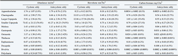 表1 南海北部氣旋式和反氣旋式渦旋上層300米浮游動物類群的總生物量