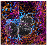 使用DAPI(細胞核,白色)、Anti-TOM 20(Alexa 488,藍色)、Anti-Tubulin(Alexa 555,橙色)和Actin-SiR(Actin,品紅色)標記的Cos-7 細胞。