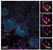 10 μm 小鼠大腦切片,Calbindin-A488(藍色),Gephyrin-A568(黃色),VGAT-A647(品紅色)。樣品由葡萄牙科英布拉大學CNC 科英布拉顯微成像中心的Luisa Cortes 提供。