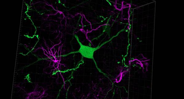 厚腦切片中的神經元和星形膠質細胞用Airyscan MPLX 4Y 模式成像,棘突和神經元形態的其他細節清晰可見
