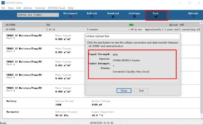 5.打開Zentra Utility,連接ZL6,點(diǎn)擊TEST,顯示通過即可正常使用。