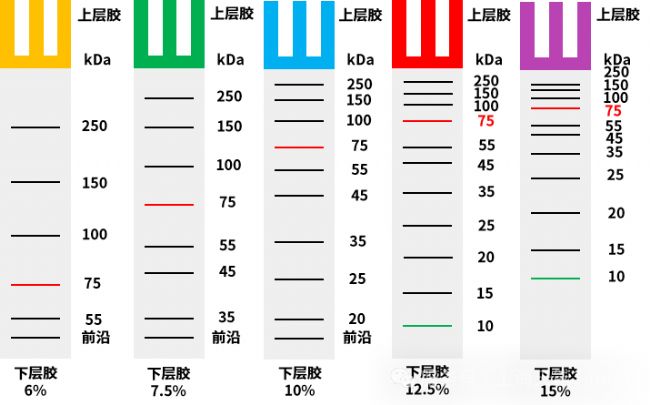 上圖為在Tris-Glycine緩沖液體系中,不同蛋白分子量在不同濃度的SDS-PAGE凝膠中的分離示意圖。實際分離情況可能會因實驗條件不同(如溫度、pH值等因素)略有出入,本圖僅供參考。