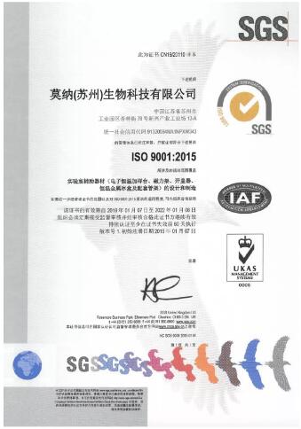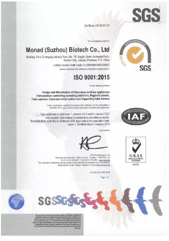 2019年1月7日,莫納(蘇州)生物科技有限公司通過了ISO9001:2015質量管理體系認證,認證范圍為:實驗室輔助器材(電子恒溫加樣臺、磁力架、開蓋器、恒溫金屬冰盒及配套管架)的設計和制造。