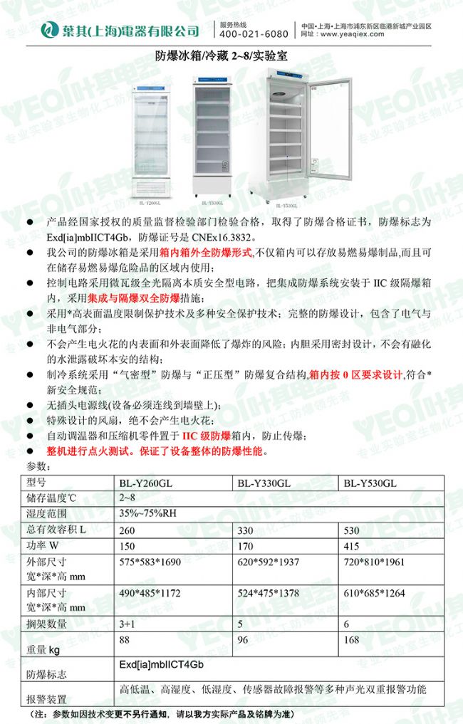 葉其(上海)電器有限公司近期推出新品溫度顯示防爆冷藏試劑柜,采用箱內外全防爆形式,集成與隔離雙全防爆措施,箱內按0區要求設計,符合*新安全規范,具體參數如下: