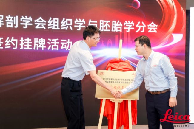 中國解剖學會副理事長、組胚分會主任委員周德山教授與徠卡顯微系統生命科學銷售總監吳長發先生進行了徠卡顯微系統與中國解剖學會組織學與胚胎學分會正式戰略簽約!中國解剖學會副理事長李和教授 ,徠卡顯微系統生命科學市場部經理方策先生共同揭牌!賦能學科建設,點燃發展引擎,徠卡將持續為科學研究和教學過程帶來有力的技術支撐。