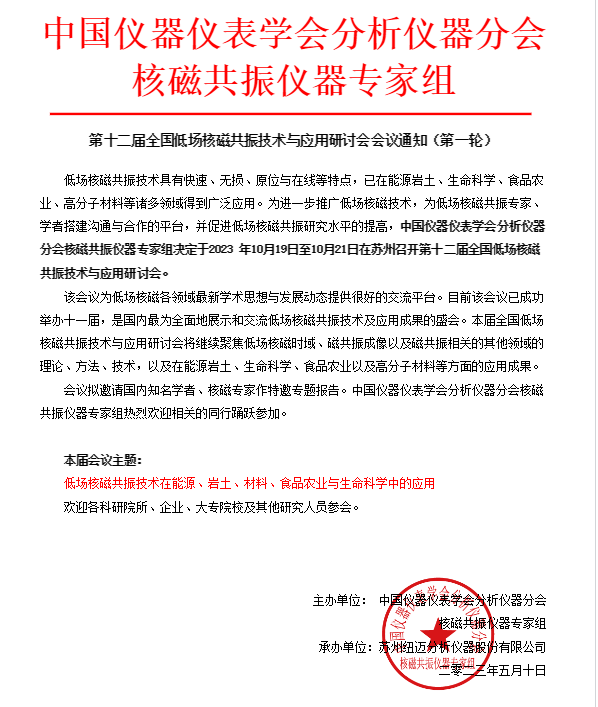 為了推廣低場核磁技術在中國的使用,以及為低場核磁共振專家、學者搭建溝通與合作的平臺,并促進提高我國低場核磁共振研究水平,中國儀器儀表學會分析儀器分會核磁共振儀器專家組決定于2023年10月19日至10月21日在蘇州召開第十二屆全國低場核磁共振技術與應用研討會。
