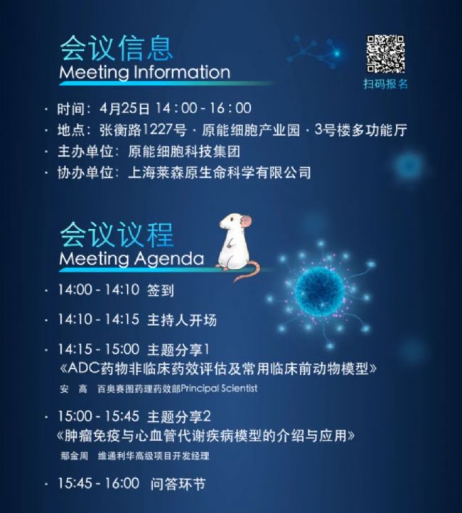 為了助力ADC藥物研究和應用的發展,為腫瘤治療領域的進步貢獻力量。將于2024年4月25日在原能細胞產業園內舉辦“ADC藥物及可用臨床前動物模型”分享會。聚焦ADC藥物及其在臨床前動物模型中的應用,深入探討ADC藥物的最新研究進展、臨床前動物模型的建立和應用、ADC藥物在臨床前研究中的挑戰與解決方案等內容。