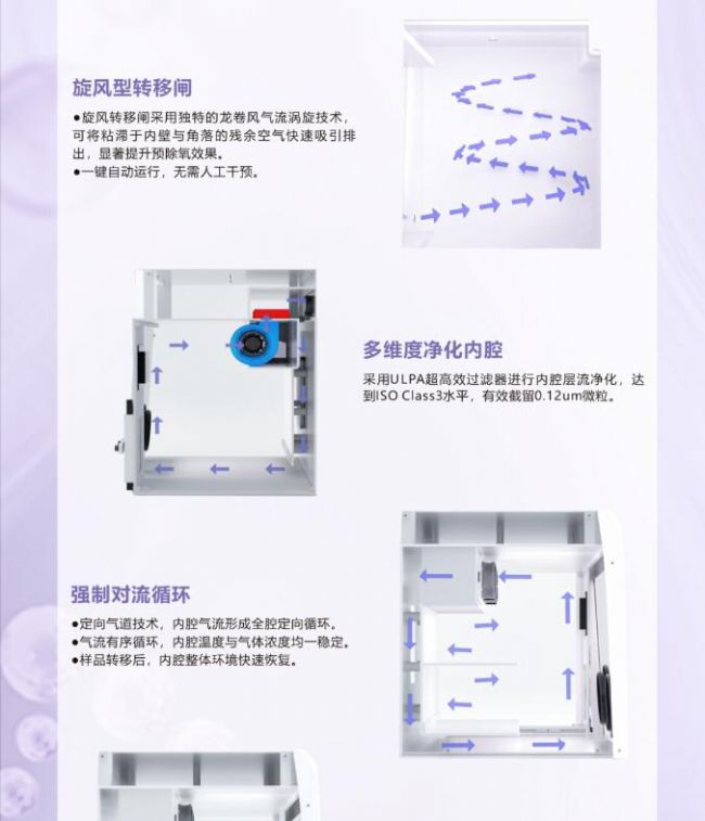 • 旋風轉移閘采用獨特的龍卷風氣流渦旋技術,可將粘滯于內壁與角落的殘余空氣快速吸引排出,顯著提升預除氧效果,