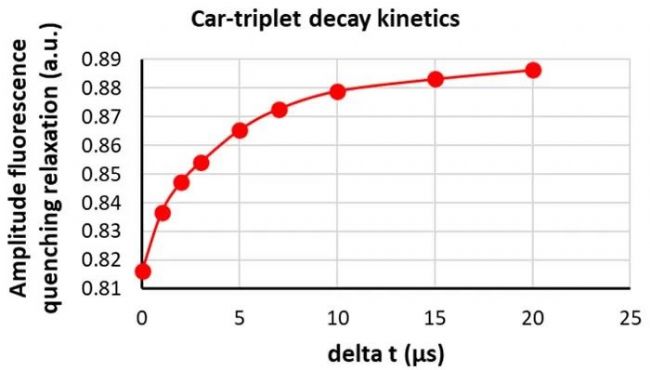 下圖顯示了一組測量值,根據這些測量值可以確定類胡蘿卜素三重態衰變動力學。該數據集說明了閃光時間的精度,以及閃光燈提供兩次相隔1μs的相同強度閃光的能力。