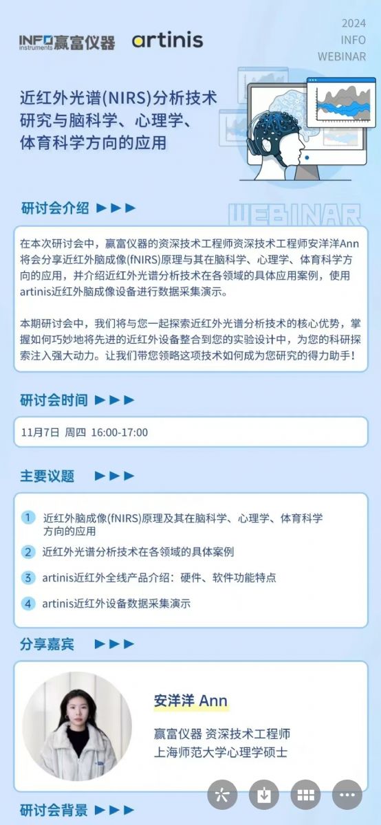 11月7日下午4點舉行線上研討會,我們的資深技術工程師安洋洋Ann將會分享近紅外腦成像(fNIRS)原理與其在腦科學、心理學、體育科學方向的應用,我們將與您一起探索近紅外光譜分析技術的核心優勢,掌握如何巧妙地將先進的近紅外設備整合到您的實驗設計中,為您的科研探索注入強大動力。