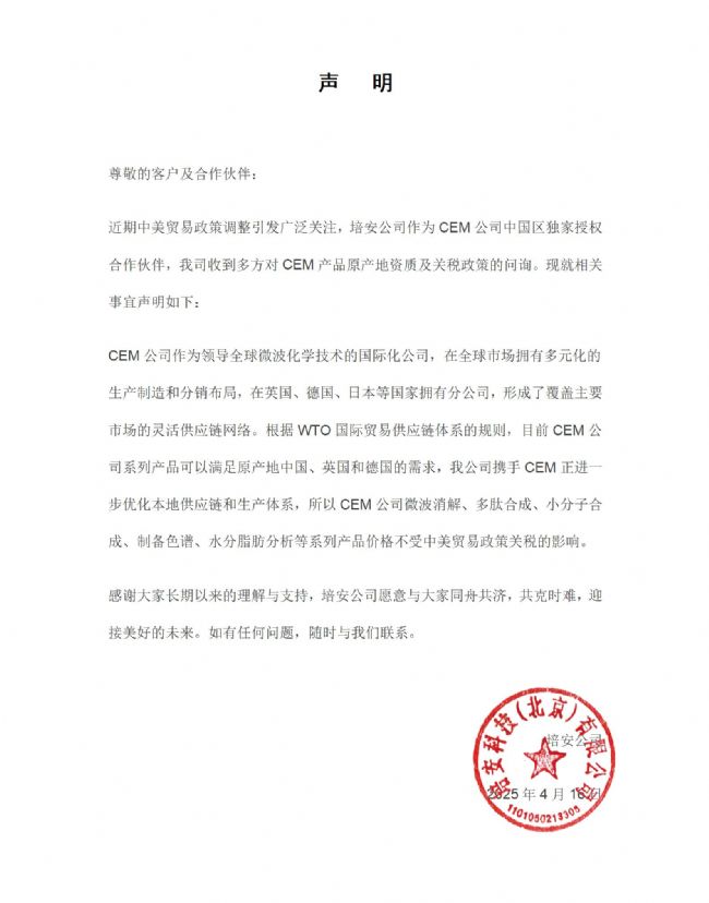 近期中美貿易政策調整引發廣泛關注,培安公司作為CEM公司中國區獨家授權合作伙伴,我司收到多方對CEM產品原產地資質及關稅政策的問詢。現就相關事宜聲明如下: