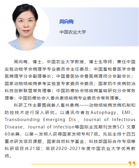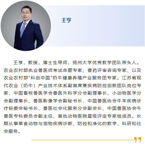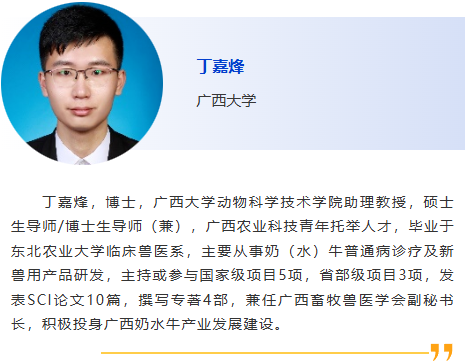 | 會(huì)前研討會(huì)3-反芻動(dòng)物疫病診斷Ⅰ 主持人:馬翀,徐闖 8:30am - 從私人獸醫(yī)的角度看出口診斷- 這些檢測真的是最適合您的出口要求并最有幫助的嗎? Em Mowrer, Stonehouse Veterinary Service 9:00am - 小型反芻動(dòng)物- 不僅僅是小牛!如何處理這些小動(dòng)物的寄生蟲和常見病,Em Mowrer, Stonehouse Veterinary Service 9:30am - 奶牛子宮內(nèi)膜炎診斷治療進(jìn)展,徐闖,中國農(nóng)業(yè)大學(xué) 10:00am - 休息 10:30am - 規(guī)模化牧場奶牛乳腺炎診斷及防控要點(diǎn),王亨,揚(yáng)州大學(xué) 11:00am - 牛支原體分離株的分子流行病學(xué)特征及致病性研究,潘子豪,南京農(nóng)業(yè)大學(xué) 11:30am –我國犢牛腹瀉的病因、診斷及防控策略研究進(jìn)展,尹鑫,哈爾濱獸醫(yī)研究所 |
