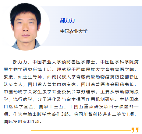 | 會(huì)前研討會(huì)8-反芻動(dòng)物疫病診斷Ⅱ 主持人:馬翀,徐闖 1:30pm - 待定,胡長敏,華中農(nóng)業(yè)大學(xué) 2:00pm - 奶牛場結(jié)核檢疫與凈化方案的探討,曹杰,中國農(nóng)業(yè)大學(xué) 2:30pm - 贊助商報(bào)告 3:00pm - 休息 3:30pm - 四川省牦牛寄生蟲感染情況調(diào)查,郝力力,西南民族大學(xué) 4:00pm –中國部分地區(qū)牛呼吸道病病原學(xué)調(diào)查與分析,程子龍,江蘇省農(nóng)業(yè)科學(xué)院 4:30pm – 廣西奶水牛產(chǎn)業(yè)現(xiàn)狀與水牛常見病診療,丁嘉烽,廣西大學(xué) |