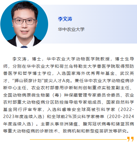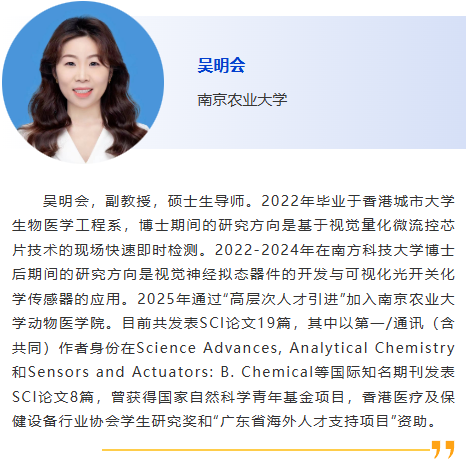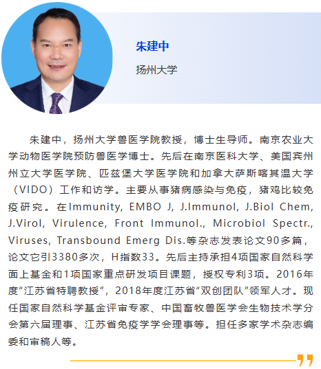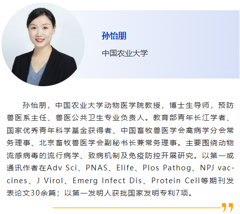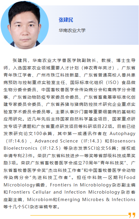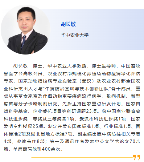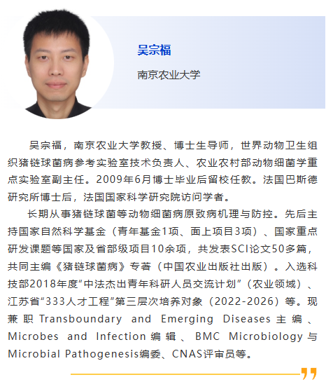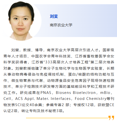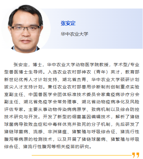 分會(huì)5-獸醫(yī)診斷新技術(shù) 主持人:劉斐, 李彬 8:30am –利用CRISPR技術(shù)作為廣譜跨屬抗病毒療法快速應(yīng)對(duì)病毒威脅:以非洲豬瘟為例及其拓展研究,Douglas Gladue, Seeklabs 9:00am - 幾種豬重要病原現(xiàn)場快速檢測技術(shù)研究,劉斐,南京農(nóng)業(yè)大學(xué) 9:30am - 贊助商報(bào)告 10:00am - 10:30am 休息, 參觀展覽 10:30am –豬病毒性腹瀉mRNA疫苗研究進(jìn)展,李彬,江蘇省農(nóng)業(yè)科學(xué)院 11:00am - 使用新型 p30 單克隆抗體偶聯(lián)石墨烯場效應(yīng)晶體管進(jìn)行超靈敏、快速、實(shí)時(shí)監(jiān)測 ASFV 檢測 基于p30單克隆抗體共軛石墨烯場效應(yīng)晶體管的超靈敏、快速、實(shí)時(shí)非洲豬瘟病毒(ASFV)新型檢測技術(shù),鄭龍三,南京農(nóng)業(yè)大學(xué) 11:30am - 用于畜禽疫病快速篩查的視覺傳感智能檢測技術(shù)面向畜禽疫病快速篩查的視覺傳感智能檢測技術(shù)研究,吳明會(huì),南京農(nóng)業(yè)大學(xué) |