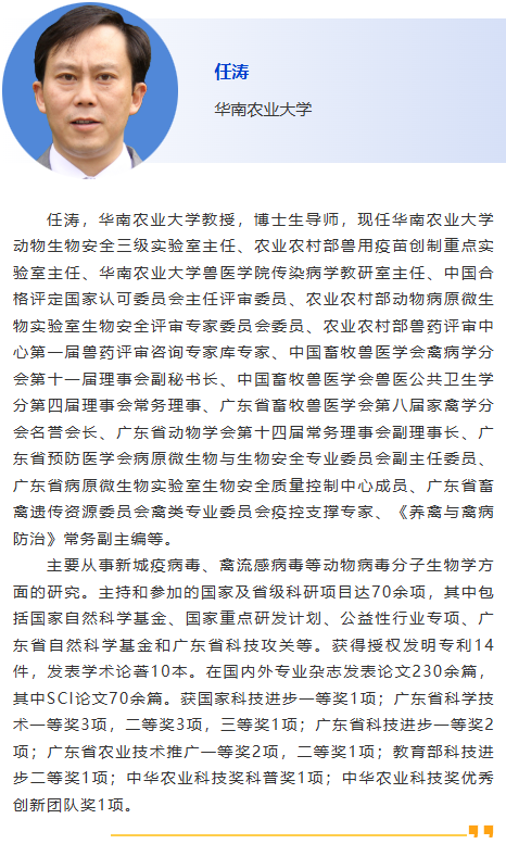 | 分會(huì)11-病毒/血清學(xué)2 主持人:張建強(qiáng), 林建涵 1:30pm – 使用免疫過氧化物酶單層試驗(yàn)(IPMA)檢測和定量暴露于PEDV和ASFV后母豬初乳中的IgG和IgA水平,蘇普特·瓦塔納潘薩克,朱拉隆功大學(xué) 1:55pm - 動(dòng)物病原高效富集和快速檢測,林建涵,中國農(nóng)業(yè)大學(xué) 2:20pm –基于納米抗體的檢測PRRSV的雙抗體夾心ELISA方法及其應(yīng)用,安同慶,哈爾濱獸醫(yī)研究所 2:40pm - 贊助商報(bào)告 3:00pm - 3:15pm 休息,參觀展覽和海報(bào) 3:15pm –豬呼吸道冠狀病毒(PRCV)的流行病學(xué)及分離株P(guān)RCV/NM的致病機(jī)制,劉平黃, 中國農(nóng)業(yè)大學(xué) 3:40pm –SAA檢測技術(shù)的建立及其在馬傳染病診斷中的應(yīng)用,胡哲,哈爾濱獸醫(yī)研究所 4:05pm –基于衣殼蛋白的地方性鼻腫瘤病毒抗原捕獲ELISA檢測方法的開發(fā)與應(yīng)用,王雪峰,哈爾濱獸醫(yī)研究所 |