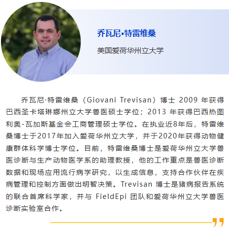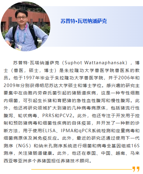 會(huì)前研討會(huì)1-豬病診斷Ⅰ 主持人:張建強(qiáng),朱建中 8:30am – 根據(jù)全球 ORF5 序列完善 PRRSV-1 的遺傳分類并研究其地理和時(shí)間分布,張建強(qiáng),愛荷華州立大學(xué) 9:00am - 越南非洲豬瘟疫情及疫苗研發(fā)最新進(jìn)展, Le Van Phan, 越南國立農(nóng)業(yè)大學(xué) 9:30am – 贊助商報(bào)告 10:00am - 休息 10:30am –二代測序在美國豬養(yǎng)殖行業(yè)中的應(yīng)用,Giovani Trevisan,愛荷華州立大學(xué) 11:00am - 非洲豬瘟和藍(lán)耳病的免疫學(xué)診斷,朱建中,揚(yáng)州大學(xué) 11:30am –豬場疫病檢測監(jiān)測體系研究,張安定,華中農(nóng)業(yè)大學(xué) |