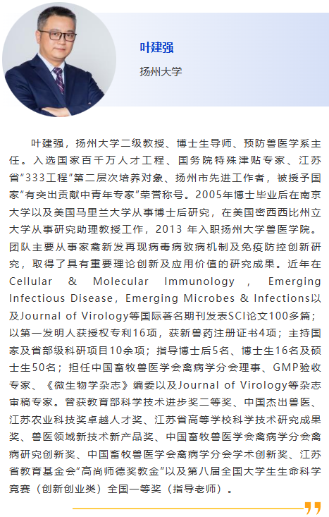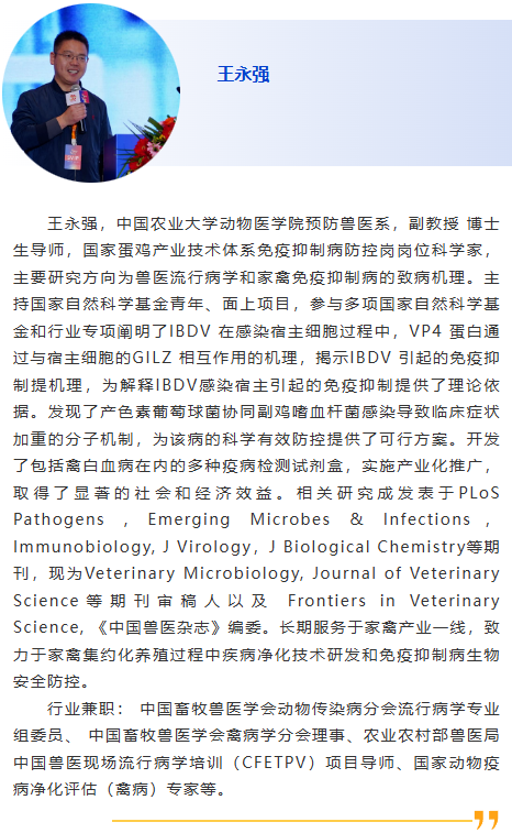 | 會(huì)前研討會(huì)2-禽病診斷Ⅰ 主持人:張建民,Mohamed EI-Gazzar 8:30am – 家禽細(xì)菌性病原及其在禽病中的不同作用,Mohamed EI-Gazzar,愛荷華州立大學(xué) 9:00am – 禽偏肺病毒,北美另一種新出現(xiàn)的疾病,Mohamed EI-Gazzar,愛荷華州立大學(xué) 9:30am – 贊助商報(bào)告 10:00am - 休息 10:30am –當(dāng)前雞病流行特點(diǎn)及疾病的病理學(xué)診斷分析,劉思當(dāng),山東農(nóng)業(yè)大學(xué) 11:00am –靶向Hexon蛋白188R位點(diǎn)可鑒別高致病性血清4禽腺病毒的單克隆抗體,葉建強(qiáng),揚(yáng)州大學(xué) 11:30am –家禽重要病原的精準(zhǔn)智能檢測技術(shù)研究,張建民,華南農(nóng)業(yè)大學(xué) |