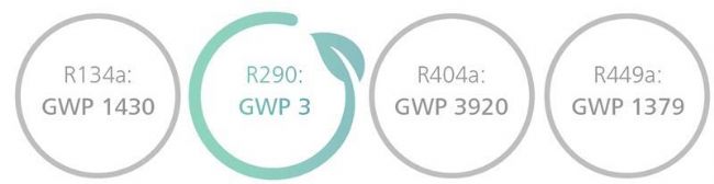 HRC 2 green 使用天然環保制冷劑 R290,全力響應全球可持續發展戰略要求。 天然制冷劑R290的全球變暖潛能值(GWP)明顯低于傳統制冷劑,如 R134a