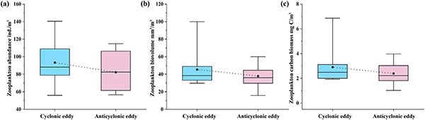 圖4 2023年4月南海北部氣旋和反氣旋渦旋上層300米浮游動物總生物量的箱線圖。