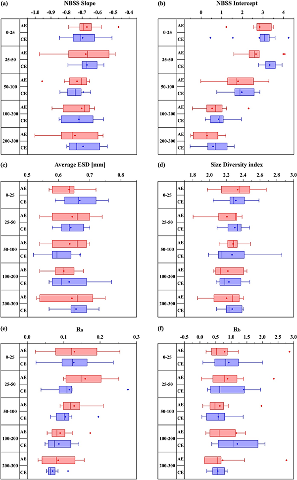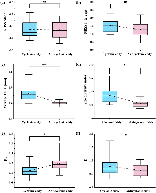 圖5 2023年4月南海北部上層300米內受氣旋渦旋和反氣旋渦旋影響的浮游動物功能性指標箱線圖。(a)NBSS斜率;(b)NBSS 截距;(c)ESD;(d)粒徑多樣性指數;(e)食肉浮游動物與食草/雜食浮游動物豐度比;(f)食肉浮游動物與食草/雜食浮游動物生物體積比。