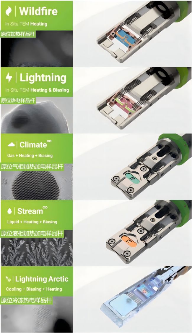 DENSsolutions 產品可以為原位 TEM 樣品施加外界刺激,捕捉 TEM 樣品在真實環境下的動態現象。目前提供的四種原位實驗方案:Wildfire TEM 原位加熱方案、Lightning TEM 原位熱電方案、Arctic TEM 原位低溫冷凍熱電方案、Climate Infinity TEM 原位氣相加熱加電方案和 Stream Infinity TEM 原位液相加熱加電方案,為各學科領域在相關條件下研究各種材料和工藝開辟了前所未有的可能性。
