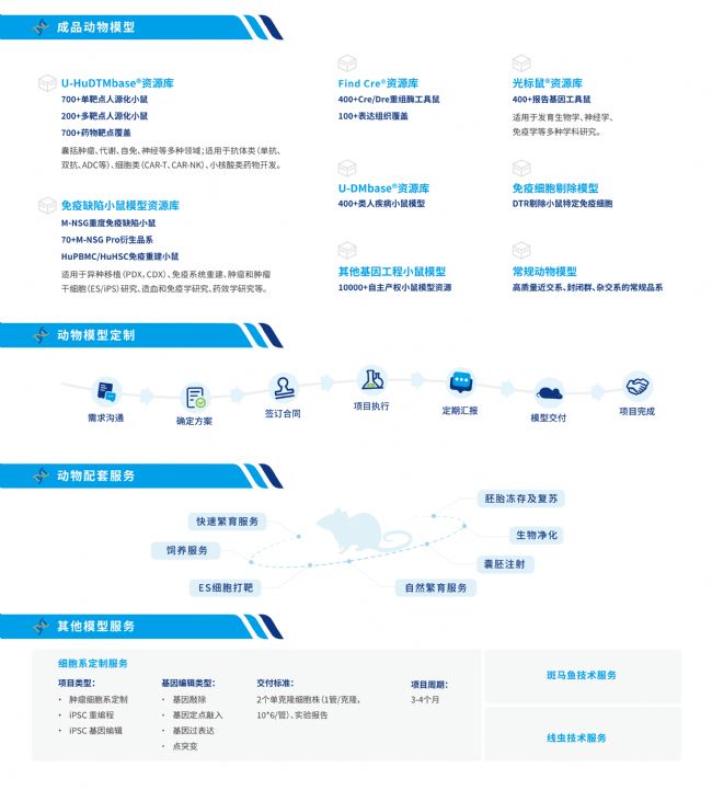 南模生物擁有經驗豐富的模型定制團隊,可為客戶定制敲除、條件性敲除、點突變、人源化、敲入等多種類型的基因編輯小鼠。此外,南模生物擁有含上萬種成品小鼠的模型資源庫,基本覆蓋熱門基因的敲除/條件性敲除小鼠、免疫缺陷小鼠、靶點人源化小鼠、自發疾病小鼠、Cre/Dre 工具鼠、熒光示蹤小鼠等。
