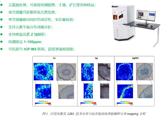 根部在植物養分供應、抵御過量金屬離子毒害等方面發揮著關鍵作用,但根部元素分析的難度遠高于莖部組織:與莖、芽相比,植物根部更為細小且干物質含量低,不僅不易精準切割,且待分析元素相對含量較低;同時,根部樣品柔軟多汁,難以維持原有結構形態,這給元素分布的精準檢測帶來了極大挑戰。本案例采用雙激發 LIBS 技術,對蠶豆幼苗根部納米銀顆粒(直徑 21.7±2.3 nm)開展 mapping(元素分布圖)分析,可直接檢測自然狀態下的植物組織元素,不僅獲得了較高的 mapping 分辨率,更保障了檢測靈敏度 —— 這也是 LIBS 技術領域首次實現對植物根部納米顆粒分布的精準分析。