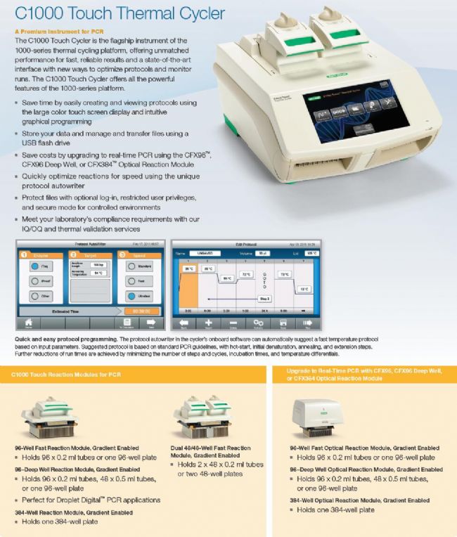 C1000 Touch PCR 儀快速,可靠,具有精湛的溫控性能。模塊化設計可實現反應模塊的快速更換,反應模塊包括:雙 48 孔溫度梯度快速模塊,96 孔溫度梯度快速反應模塊,96 孔深孔溫度梯度反應模塊,384 孔溫度梯度反應模塊,CFX96™ 光學反應模塊,CFX384™ 光學反應模塊。無需額外工具,能滿足不同實驗的要求。