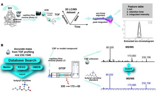 腦脊液(CSF)在中樞神經系統中分泌,并充滿了心室、大腦的蛛網膜下腔和脊柱。腦脊液的作用在于保護大腦免受物理沖擊。此外,腦脊液通過主動運輸或大量流動(從大腦中的細胞外液到蛛網膜下腔,最后進入靜脈血管和淋巴系統)在血液中過濾營養物質和化學物質的循環以及通過去除有機酸進行廢物管理過程中也起著重要作用。已知人腦脊髓液富含用于神經退行性疾病和神經系統疾病的小分子生物標志物。雖然腦脊液不容易獲得,但其代謝相對簡單,對中樞神經系統疾病的潛在重要性,使其在生物醫學研究和臨床化學中特別重要。
